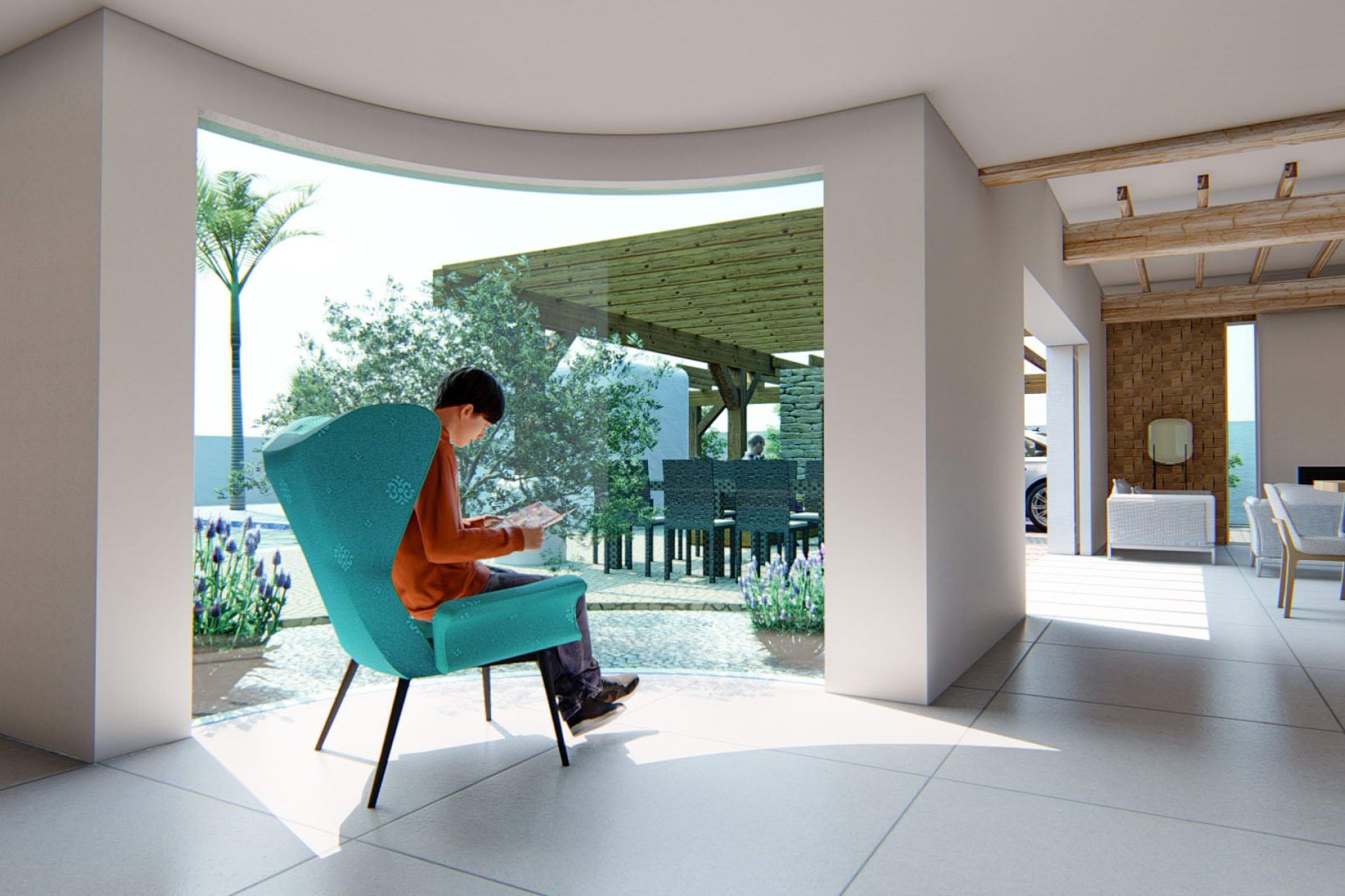 El interior se organiza en torno a un salón con una altura superior a la normal, decorado con tonos cálidos de madera en vigas del techo, paneles en muros y armarios de cocina. La zona de noche incluye dormitorios, baños, lavadero y un despacho, dividida de la zona pública por un hall en forma de rotula con un cristal curvo, que se despliega hacia la zona de la piscina y un olivo, creando un ambiente acogedor y elegante. Además, se dispone de un trastero exterior para almacenamiento adicional.